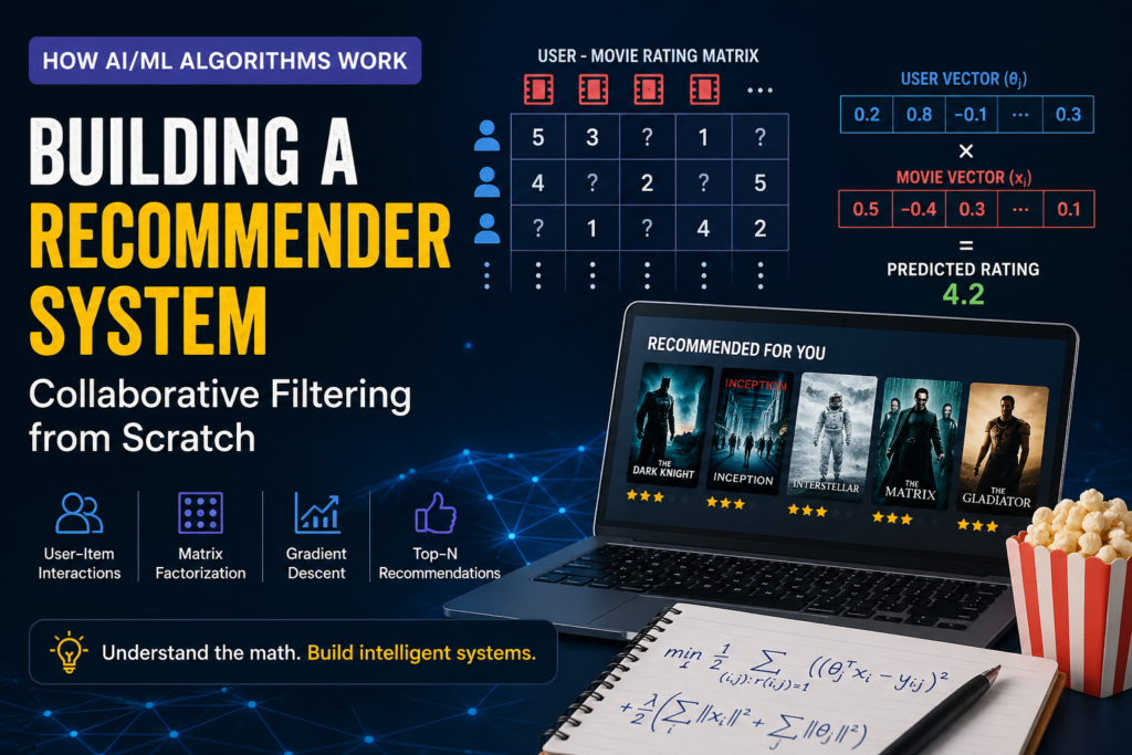 Note from this section – The cost function measures the discrepancy between predicted and actual ratings, but only over observed entries. A regularization term is added to prevent the model from assigning excessively large values to the latent features, ensuring better generalization.