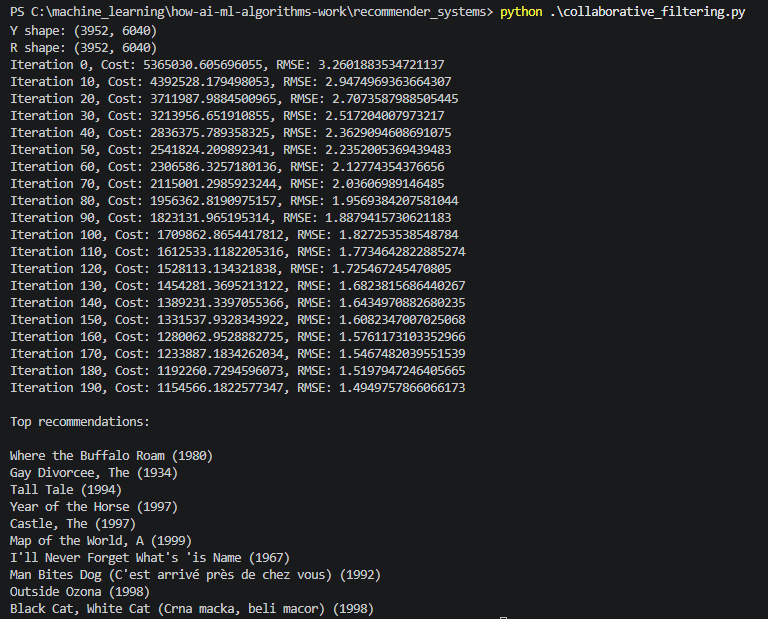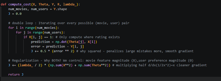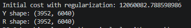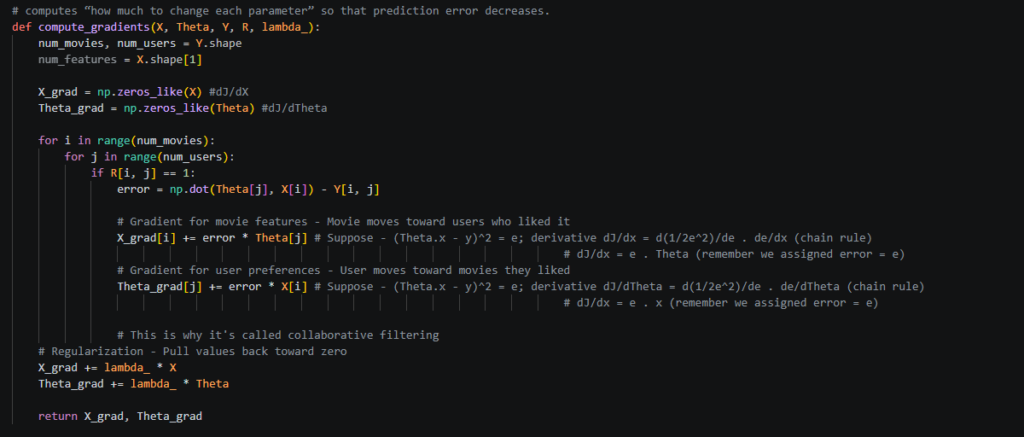 We have constructed a user–movie ratings matrix, initialized our model parameters randomly, and computed the cost to measure how far our predictions are from actual ratings. We then derived the gradients, which tell us how the cost changes with respect to each parameter.